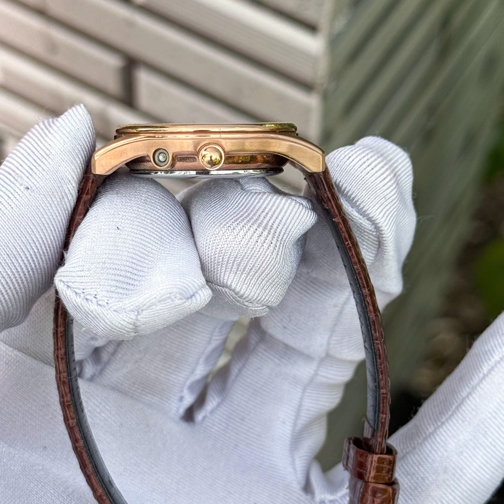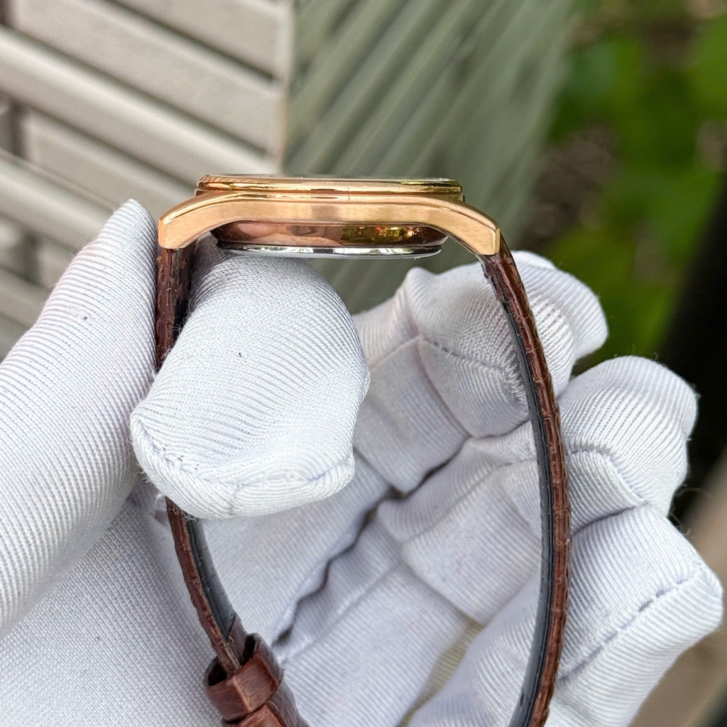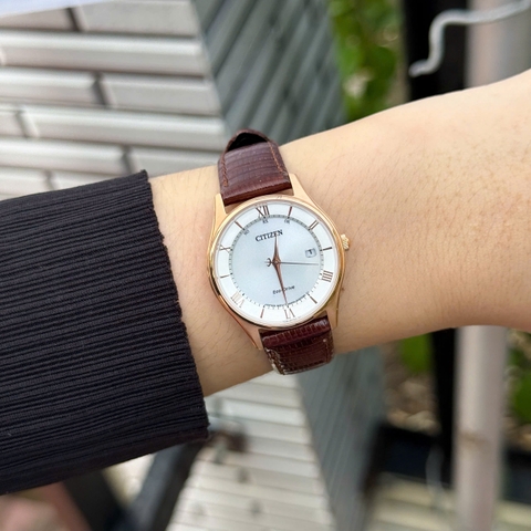 Mặt số bạc, kim và cọc số thanh mảnh, kính sapphire chống xước. Vỏ thép mạ vàng hồng, dây da nâu sang trọng. Phù hợp phong cách công sở, nữ tính, nhẹ nhàng như váy, áo blouse, đầm hoặc smart-casual.