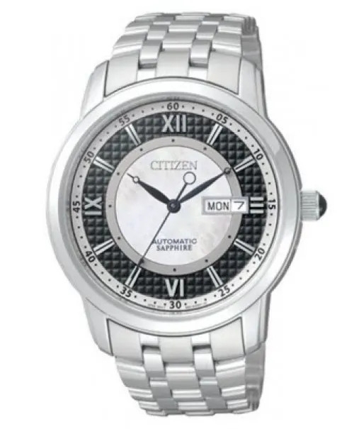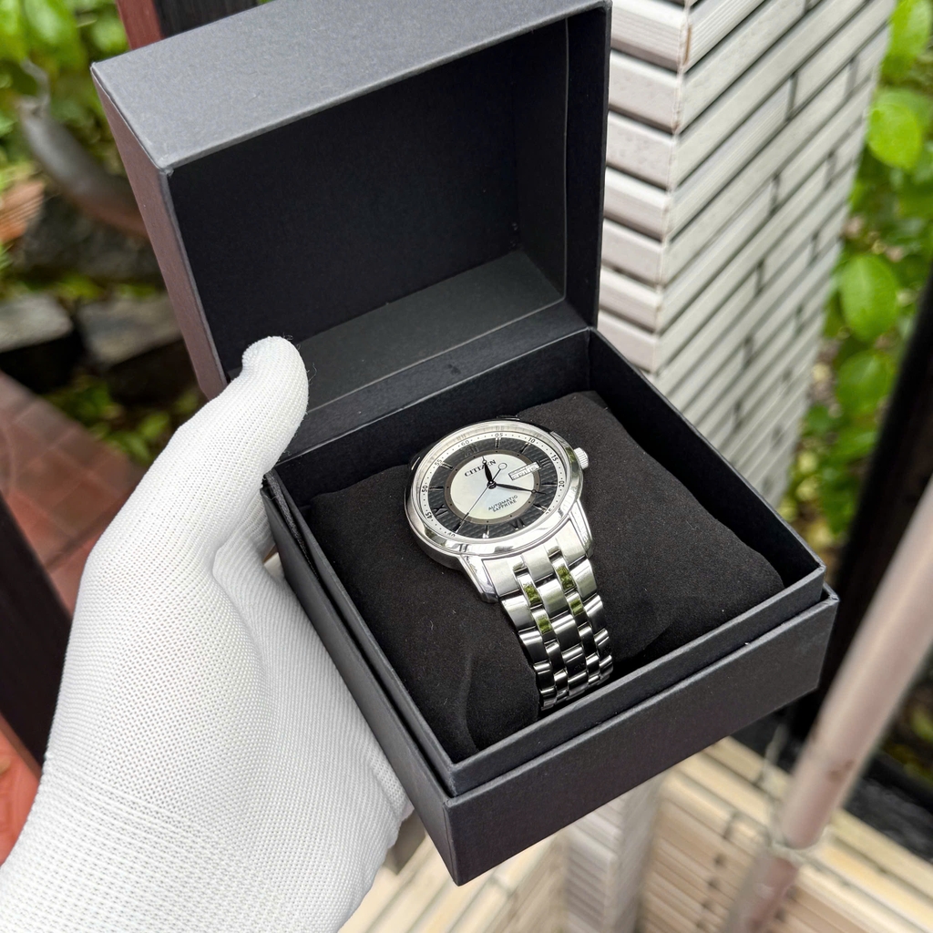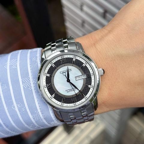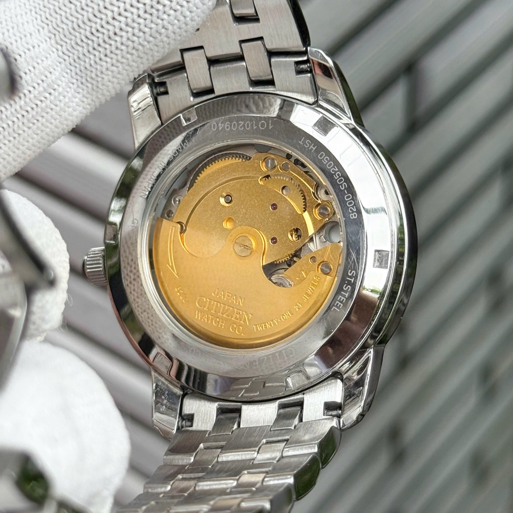 NH8305‑53E sử dụng máy Automatic (cơ tự động) — thông số nhà phân phối không cho biết rõ số chân kính hay tần số — nhưng theo dòng Citizen thường là 21 hoặc 24 chân kính, dao động 21.600 vph. Mẫu này không hỗ trợ lên cót tay và không có hacking stop (không dừng kim giây khi chỉnh giờ). Ngoài giờ, phút, giây, đồng hồ còn có lịch thứ và lịch ngày — 2 ô lịch tích hợp trên mặt số