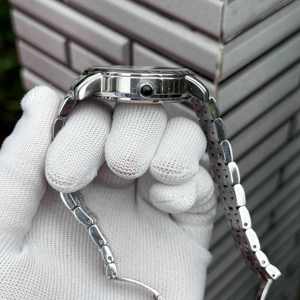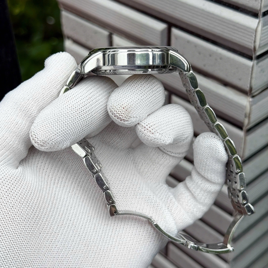 Mặt số trắng viền đen (trắng chính giữa, viền đen ngoài) với kim thanh mảnh màu bạc và cọc số đơn giản, dễ đọc. Kính là sapphire chống xước cao. Vỏ và dây làm từ thép không gỉ bạc đồng tông, núm thép kiểu truyền thống. Thiết kế này hợp với phong cách lịch lãm công sở – sơ mi, vest nhẹ –, cũng có thể phối smart casual như áo polo + quần vải để giữ vẻ sang trọng mà không quá cứng nhắc.