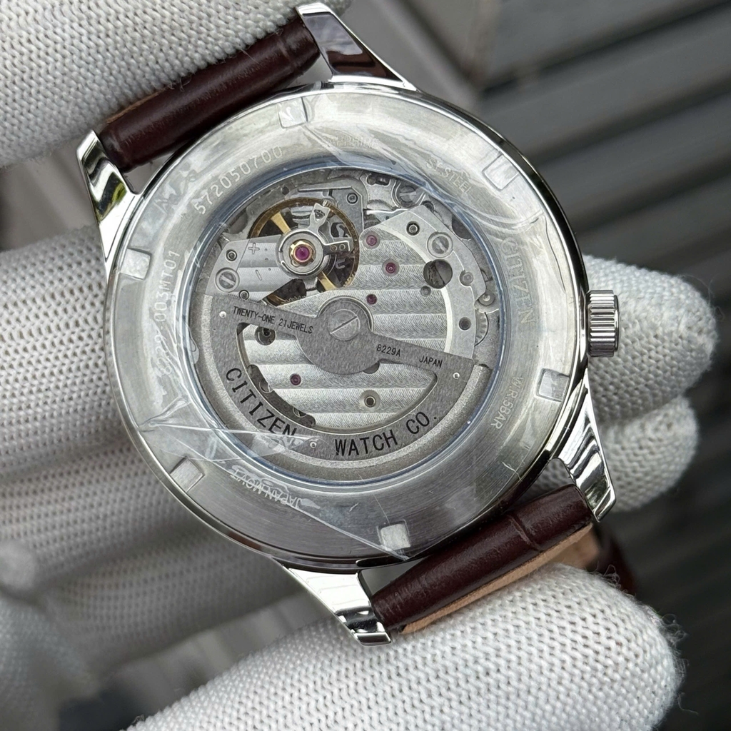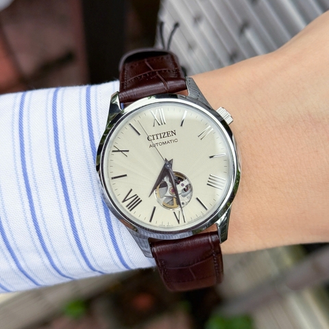 Citizen Automatic Open Heart NH9130-17A sở hữu mặt số trắng bạc tinh tế, cửa sổ lộ tim ở vị trí 6 giờ, kim và cọc số dạng baton màu bạc. Kính sapphire chống trầy, vỏ thép không gỉ sáng bóng kết hợp dây da nâu cổ điển, núm vặn đồng màu. Khả năng chống nước 50m, phù hợp phong cách thanh lịch, cổ điển và tinh tế nơi công sở.