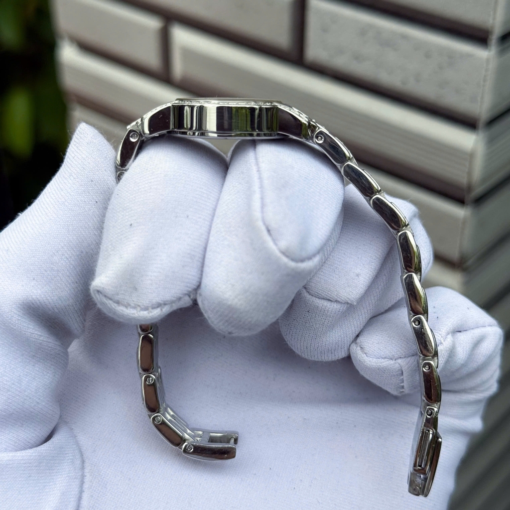 Mặt số xà cừ óng ánh, kim và cọc số màu bạc thanh mảnh. Kính khoáng cứng chống trầy nhẹ, vỏ và dây thép không gỉ mạ bạc sang trọng. Núm chỉnh giờ nhỏ nhắn cùng tông màu. Thiết kế phù hợp với phong cách thanh lịch, hiện đại, đặc biệt khi kết hợp cùng trang phục công sở, dạ tiệc hoặc những dịp trang trọng cần sự tinh tế.