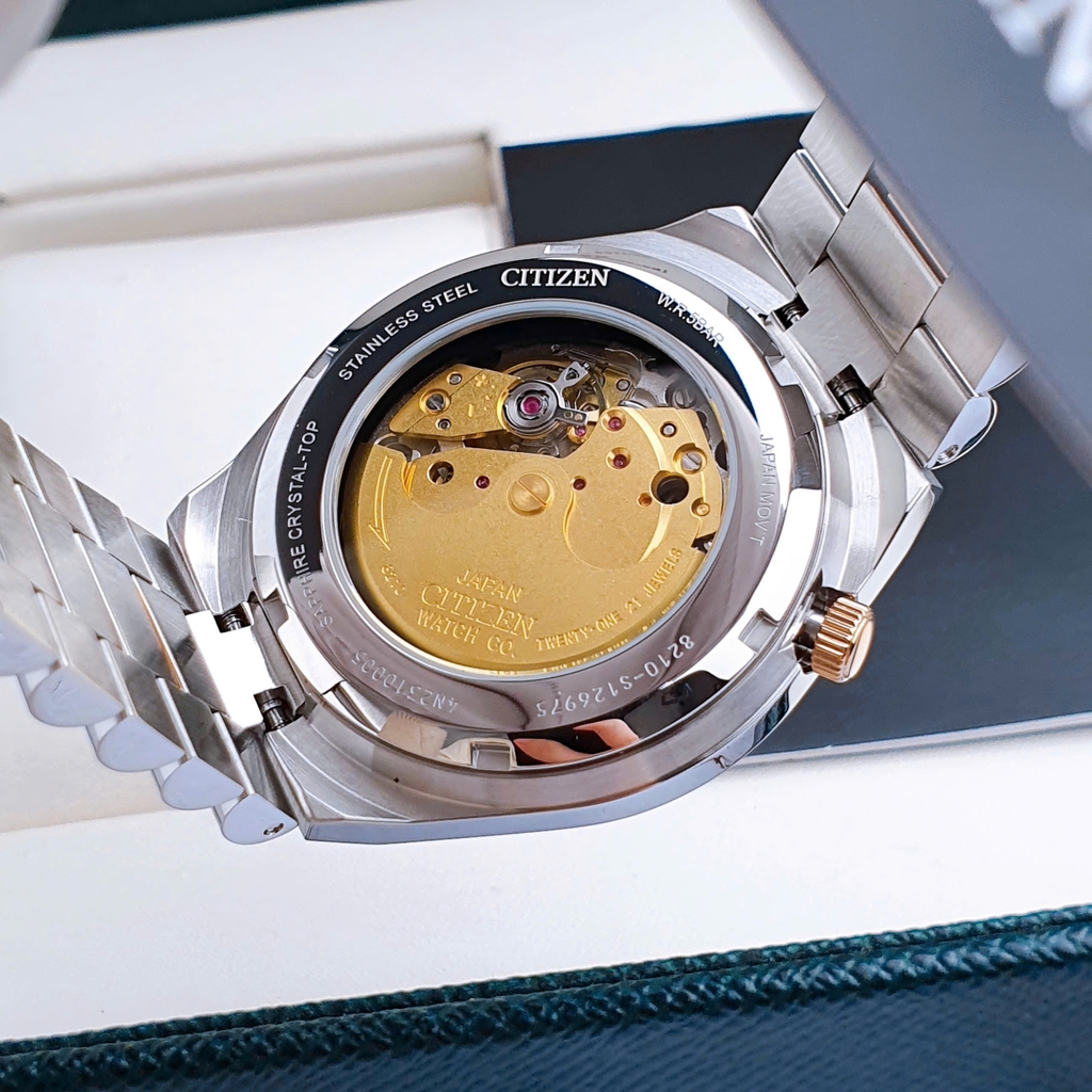Citizen Tsuyosa Mechanical Black Demi Gold NJ0154-80H sở hữu mặt số xám đen khói chải tia, tạo hiệu ứng chuyển sắc tinh tế. Kim và cọc số dạng baton mạ vàng, thiết kế sắc nét, dễ quan sát. Kính sapphire phẳng, vỏ thép không gỉ phối demi vàng, núm đồng bộ. Khả năng chống nước 50 mét, dây thép demi vàng phù hợp phong cách công sở và smart-casual.