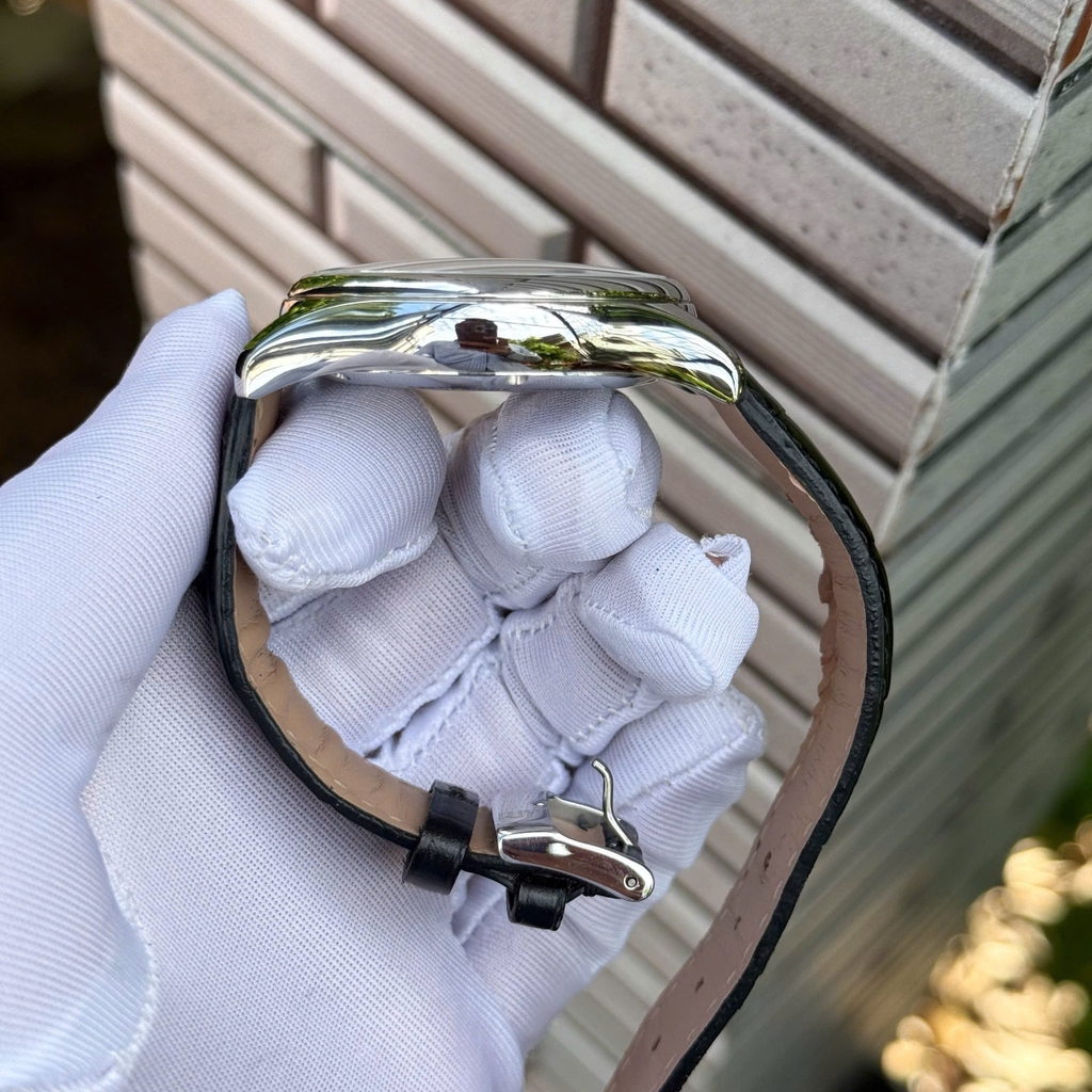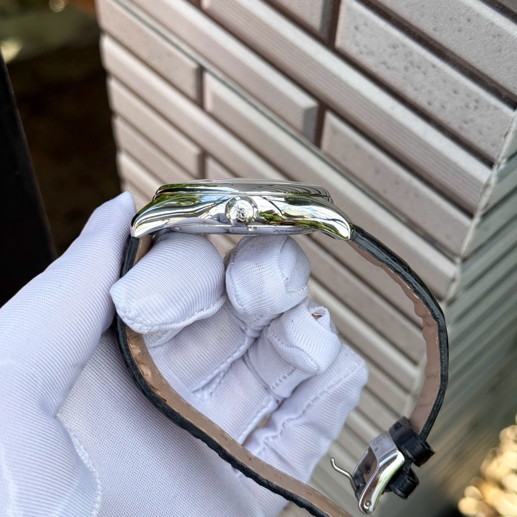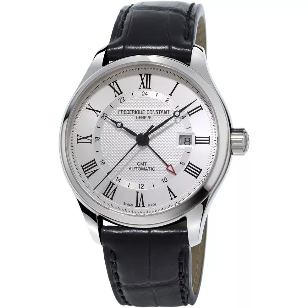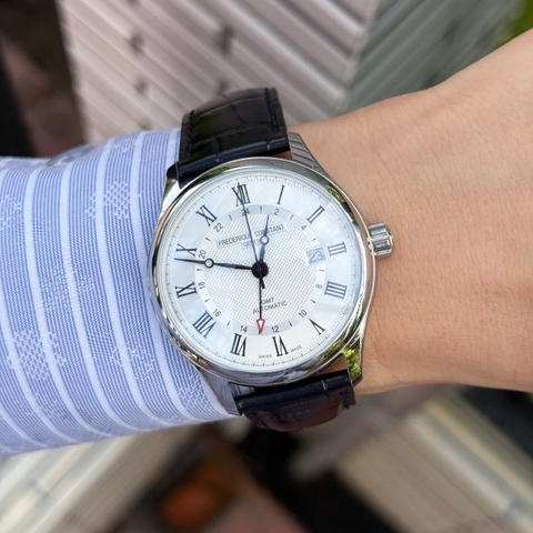 Frederique Constant Classic FC-350MC5B6 GMT sở hữu mặt số trắng bạc họa tiết guilloché, kim đen thanh lịch, cọc số La Mã cổ điển và vòng 24h hiển thị múi giờ thứ hai. Kính sapphire cong, vỏ thép mạ bạc sáng, dây da đen lịch lãm. Khả năng chống nước 50m. Thiết kế đậm chất cổ điển pha hiện đại, lý tưởng cho doanh nhân yêu phong cách tinh tế và sang trọng châu Âu.