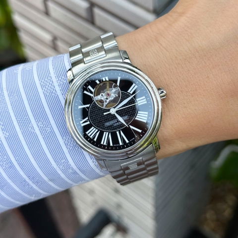 Frederique Constant Classic Open Heart Black Dial FC-310B3P6B sở hữu mặt số đen thanh lịch, điểm lộ cơ tinh tế ở vị trí trung tâm tạo chiều sâu cuốn hút. Kim và cọc số tông bạc nổi bật, dễ quan sát. Kính sapphire chống trầy xước hiệu quả. Chống nước 50m, phù hợp phong cách lịch lãm, công sở hoặc trang phục trang trọng.