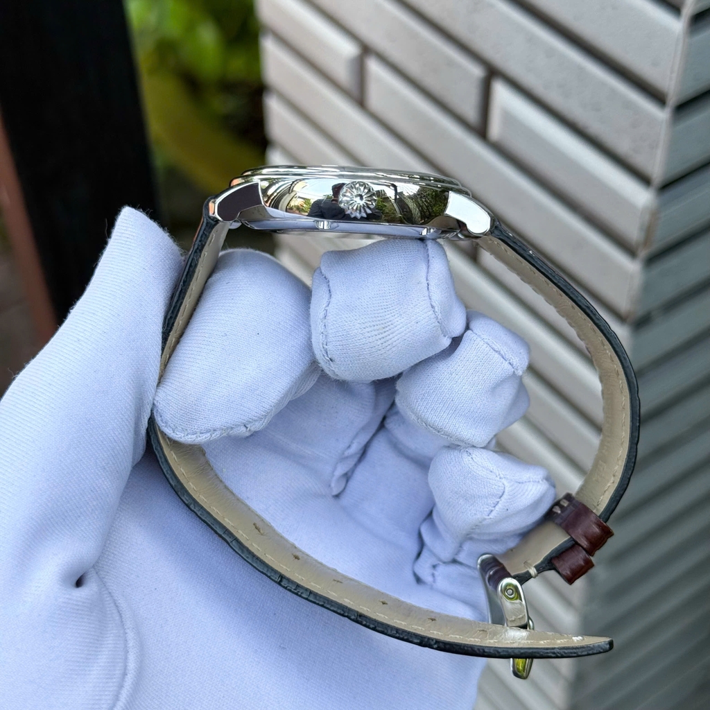 Frederique Constant Heart Beat Date FC-315MS3P6 sở hữu mặt số bạc trang trí guilloché tinh tế, kim xanh navy nổi bật, cọc số La Mã cổ điển và cửa sổ Heart Beat ở 12 giờ phô diễn bộ máy trắng thanh nhã. Ô lịch ngày đặt tại 6 giờ. Kính sapphire chống trầy, vỏ thép sáng bóng, dây da nâu cổ điển. Khả năng chống nước 50m. Phong cách sang trọng, phù hợp quý ông công sở lịch lãm.
