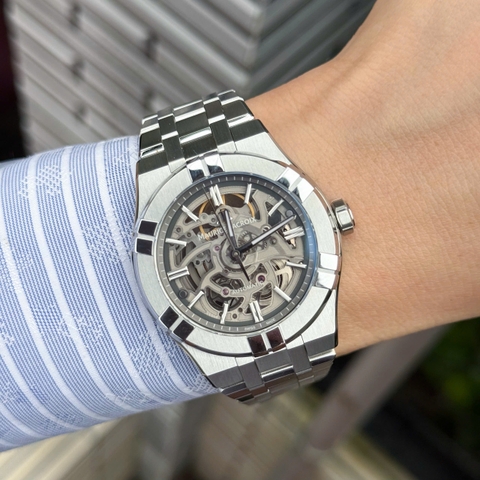 Maurice Lacroix Aikon Skeleton Grey AI6007-SS002-030-1 nổi bật với mặt số xám khói trong suốt, kim và cọc số bạc phủ dạ quang dưới lớp kính sapphire chống trầy. Vỏ và núm thép không gỉ màu bạc, chống nước 200 mét, phù hợp phong cách công sở hiện đại hoặc trang phục thời trang cao cấp, thể hiện sự tự tin và gu thẩm mỹ tinh tế của người đeo.