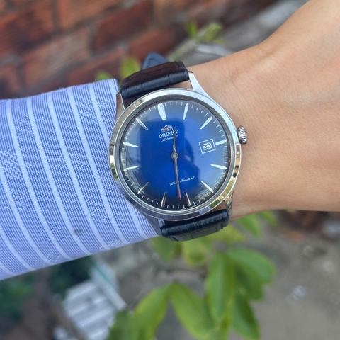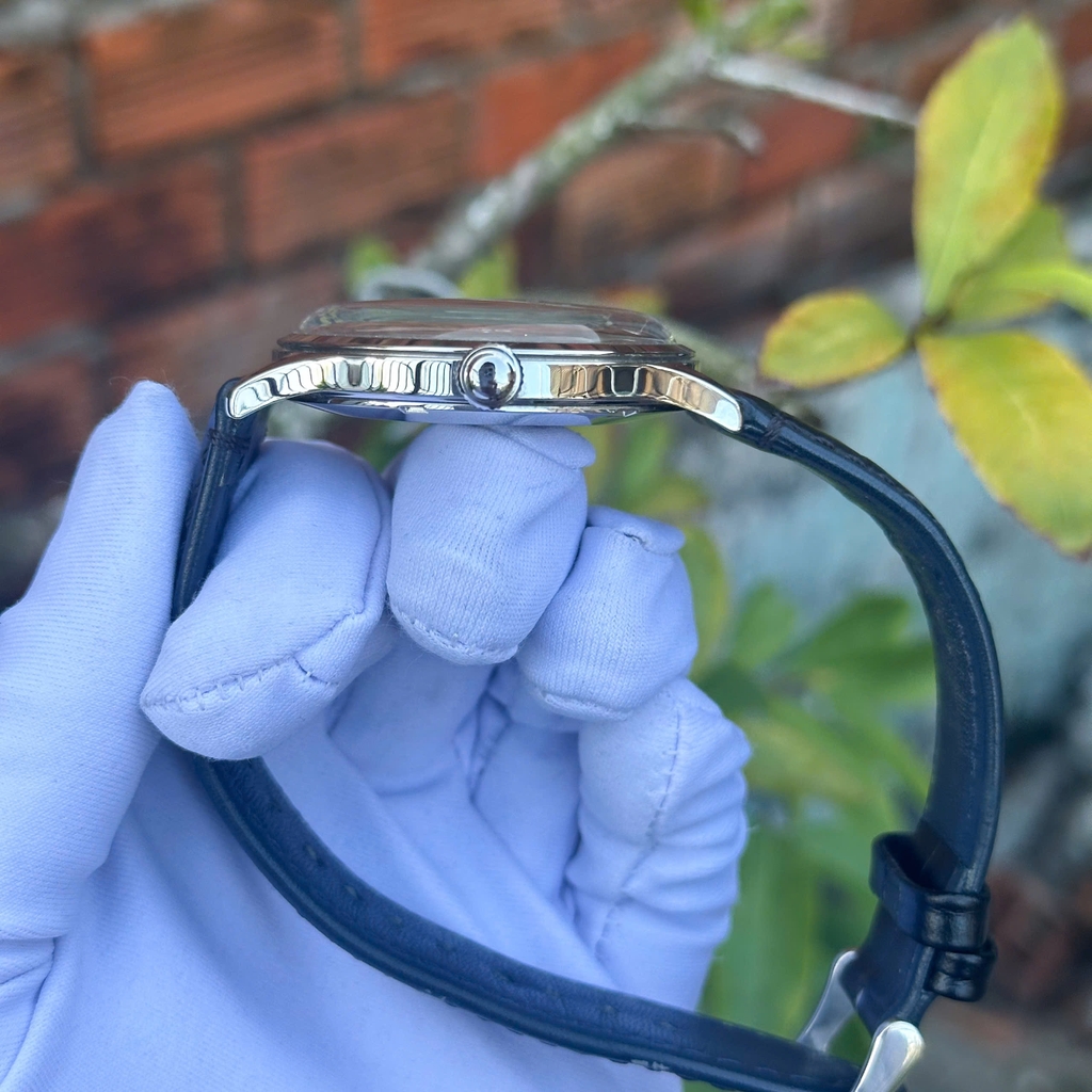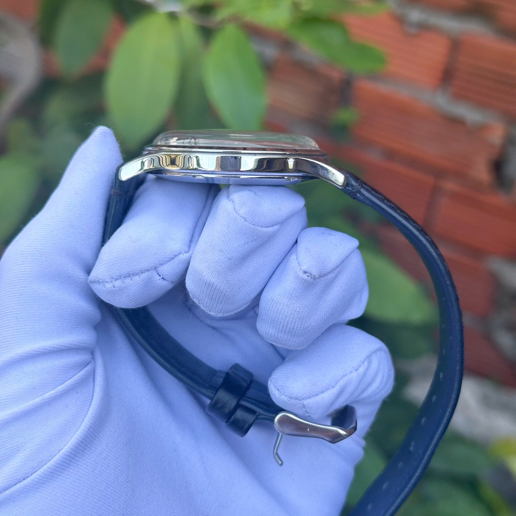 Mặt số xanh navy hiệu ứng sunburst, kim và cọc số mảnh màu bạc nổi bật trên nền tối. Kính cong mineral crystal, vỏ thép không gỉ sáng bóng, núm chỉnh giờ đồng bộ màu bạc, dây da tối màu sang trọng. Phù hợp phong cách công sở, sự kiện trang trọng hoặc smart-casual với blazer, sơ mi.