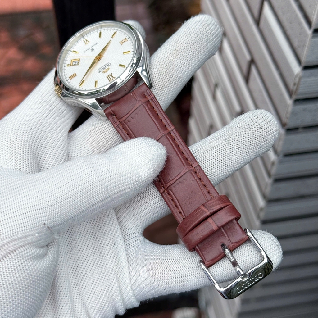 Orient SER1U001W0 có mặt số trắng họa tiết guilloché tinh tế, kim và cọc số vàng nổi bật, ô lịch ngày góc 3 giờ thanh lịch. Vỏ thép không gỉ sáng bóng, núm viền vàng đồng điệu, kính sapphire cổ điển. Dây da nâu sang trọng, chống nước 50m, phù hợp phong cách lịch lãm, tinh tế trong môi trường công sở hoặc dạo phố.