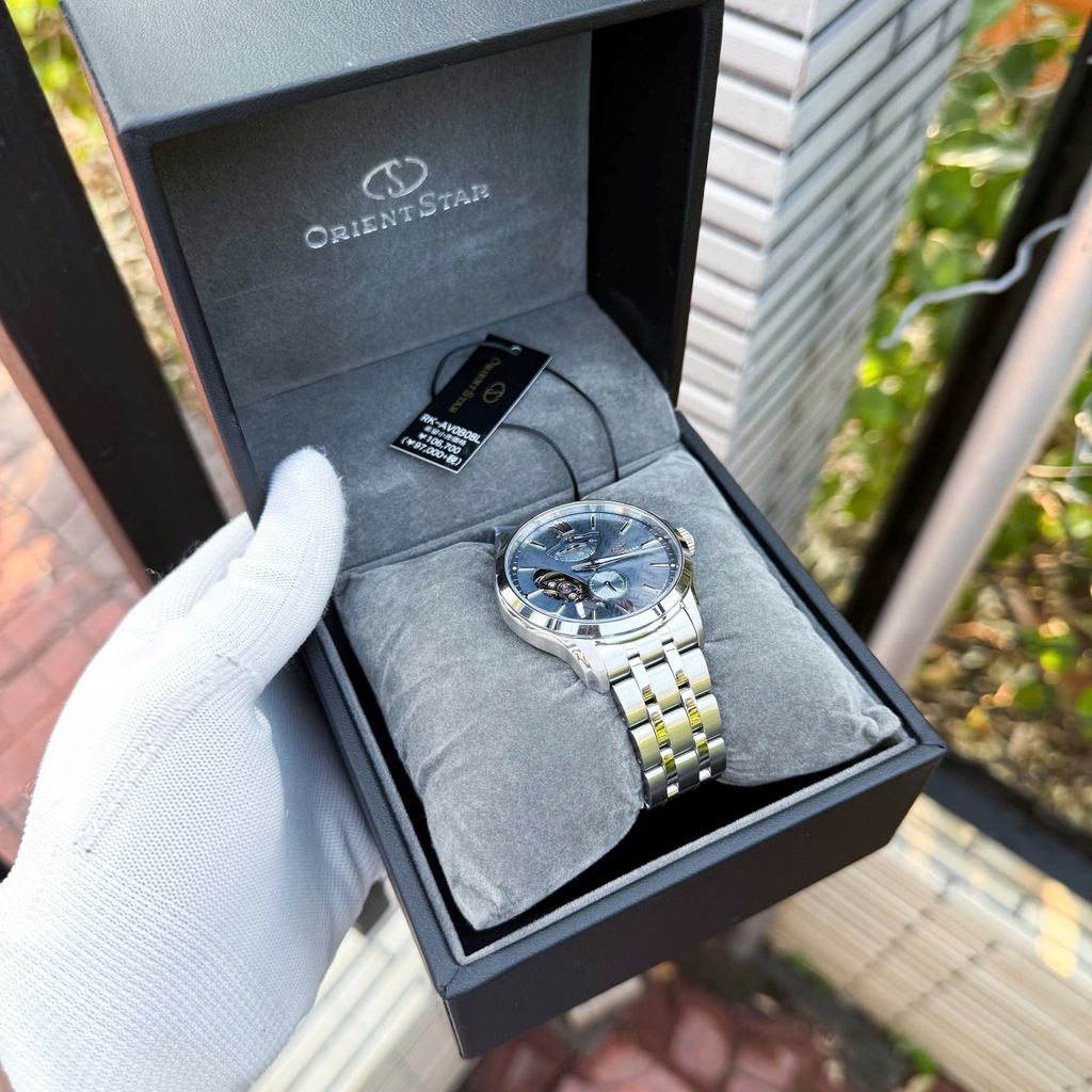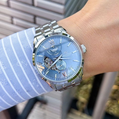 Về thiết kế của mã Orient Star Contemporary Layered Skeleton RK-AV0B08L00B: mặt số màu xanh dương nhạt, kim và cọc số sáng bạc – rõ nét khi trong bóng sáng; kính dùng sapphire chống xước; vỏ và núm bằng thép không gỉ màu bạc, dây kim loại đồng màu bạc. Khả năng chống nước 100 m, dây kim loại mang lại vẻ sang trọng — rất phù hợp với phong cách smart-casual hoặc công sở thanh lịch, phong cách Mediterannean nhẹ nhàng.