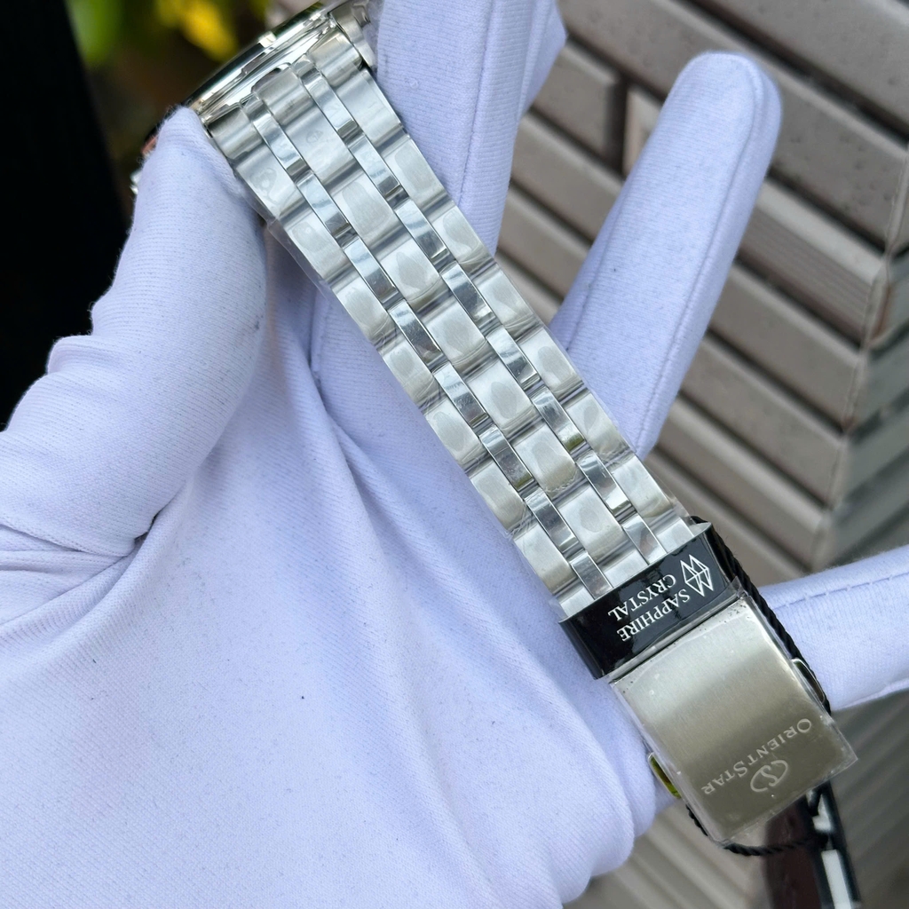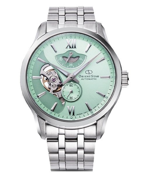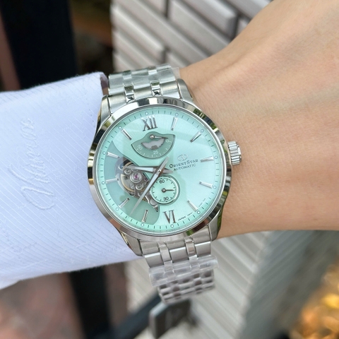 Về thiết kế của mã Orient Star Contemporary Layered Skeleton RE-AV0B11E00B: mặt số màu xanh mint (mint green), kim và cọc số sáng bạc – rõ nét khi trong bóng sáng; kính dùng sapphire chống xước; vỏ và núm bằng thép không gỉ màu bạc, dây kim loại đồng màu bạc. Khả năng chống nước 100 m, dây kim loại mang lại vẻ sang trọng — rất phù hợp với phong cách smart-casual hoặc công sở thanh lịch, phong cách Mediterannean nhẹ nhàng.