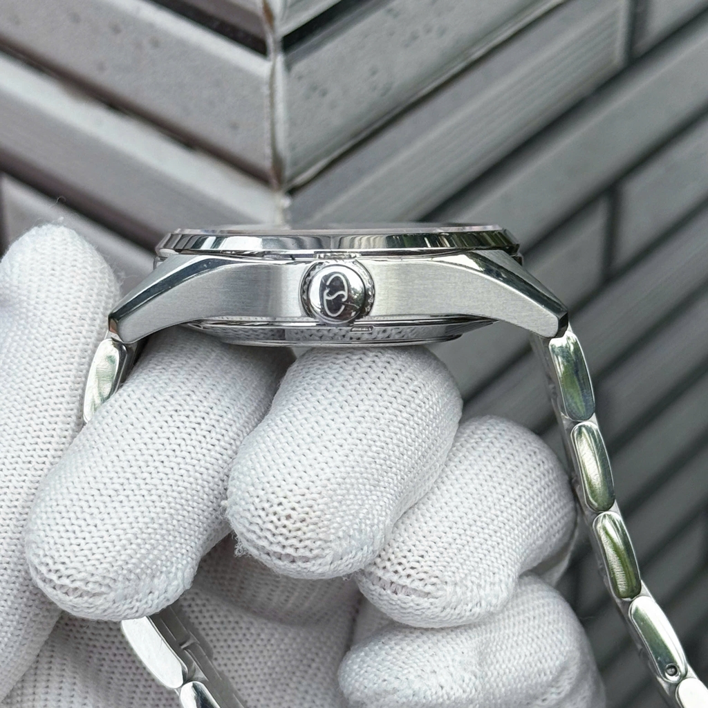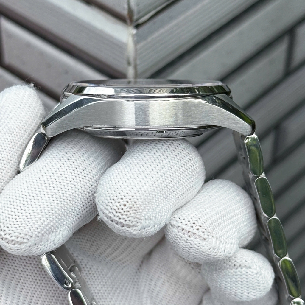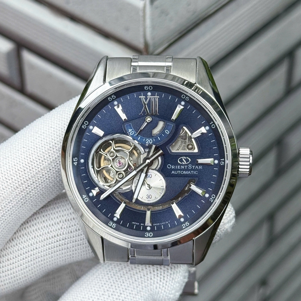 Mặt số xanh navy dạng skeleton một phần, kim dauphine phủ dạ quang và cọc số thép sắc nét. Kính sapphire cong chống trầy, vỏ thép không gỉ bạc kết hợp núm đồng bộ. Khả năng chống nước 10 ATM và dây thép khiến tổng thể mạnh mẽ, phù hợp phong cách bán cổ điển, công sở hoặc trang phục cá tính hiện đại. Tạo ấn tượng đậm chất cơ khí nghệ thuật.