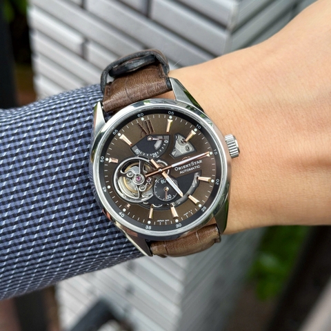 Orient Star Joker RE-AV0006Y00B sở hữu mặt số màu nâu kết hợp chi tiết skeleton lộ tim máy độc đáo, cùng kim dauphine và cọc số mạ bạc tinh tế. Kính sapphire chống trầy, vỏ và núm thép không gỉ màu bạc, khả năng chống nước 100m, mang lại sự bền bỉ trong nhiều hoàn cảnh. Thiết kế sang trọng, phù hợp phối với vest, sơ mi công sở hoặc phong cách thanh lịch, giúp khẳng định cá tính người đeo
