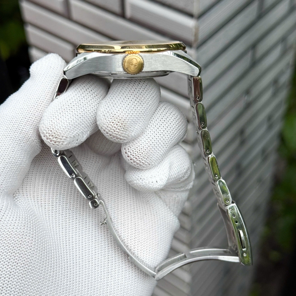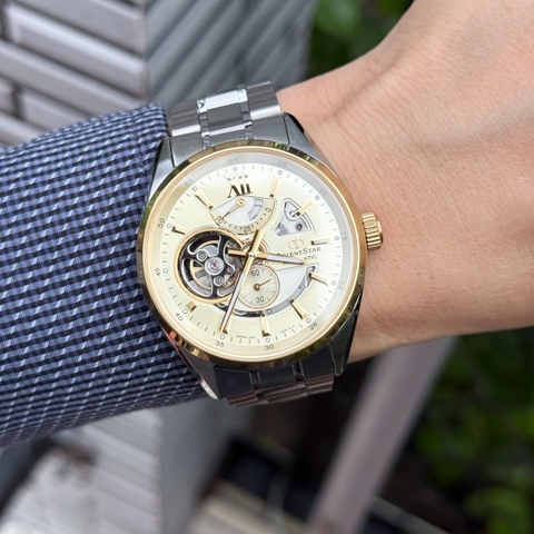 Orient Star Joker RE-AV0124G00B sở hữu mặt số vàng champagne sang trọng, kim dauphine và cọc số mạ vàng nổi bật. Lớp kính sapphire cong chống trầy cùng viền bezel và núm mạ vàng tinh tế, kết hợp dây thép không gỉ bạc sáng. Thiết kế vừa cổ điển vừa hiện đại, đồng hồ phù hợp phong cách công sở lịch lãm, tiệc trang trọng hay trang phục vest, tạo điểm nhấn sang trọng và đẳng cấp.