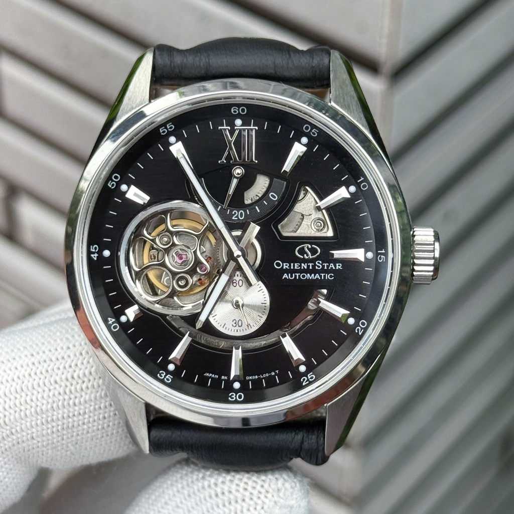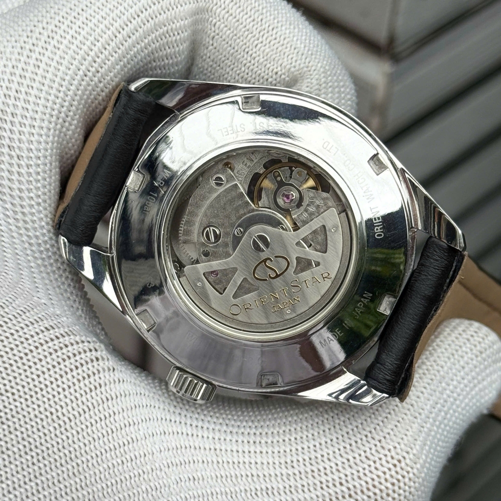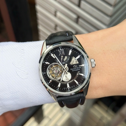 Orient Star Joker WZ0181DK (SDK05002B0) sở hữu mặt số đen mạnh mẽ, kim và cọc số mạ bạc phản quang nổi bật. Vỏ và núm thép không gỉ sáng bạc cùng kính sapphire chống trầy bảo vệ mặt số. Phần lộ máy/semi-skeleton hiện rõ chi tiết bánh răng tạo điểm nhấn kỹ thuật. Phong cách phù hợp là sang trọng công sở hoặc phối suit đen/trắng để tôn tính bí ẩn và cá tính.