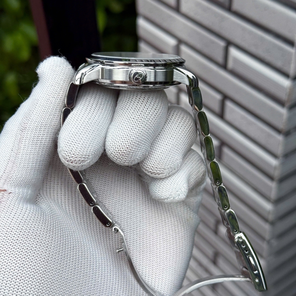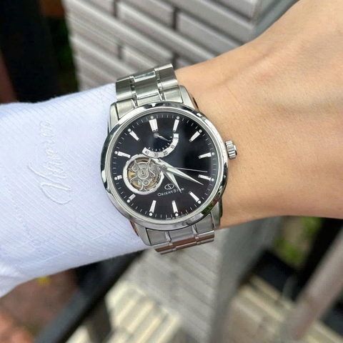 Orient Star Open Heart WZ0041DA (SDA02002B0) sở hữu mặt số đen huyền bí, kim và cọc số bạc ánh thép thanh lịch, tạo độ tương phản nổi bật. Lớp kính sapphire chống trầy kết hợp vỏ và núm thép không gỉ màu bạc sang trọng, tổng thể mạnh mẽ mà tinh tế. Ô cửa sổ lộ cơ tại vị trí 9 giờ tăng phần cuốn hút. Mẫu này phù hợp phong cách công sở lịch lãm, dạ tiệc, hoặc kết hợp trang phục tối màu.