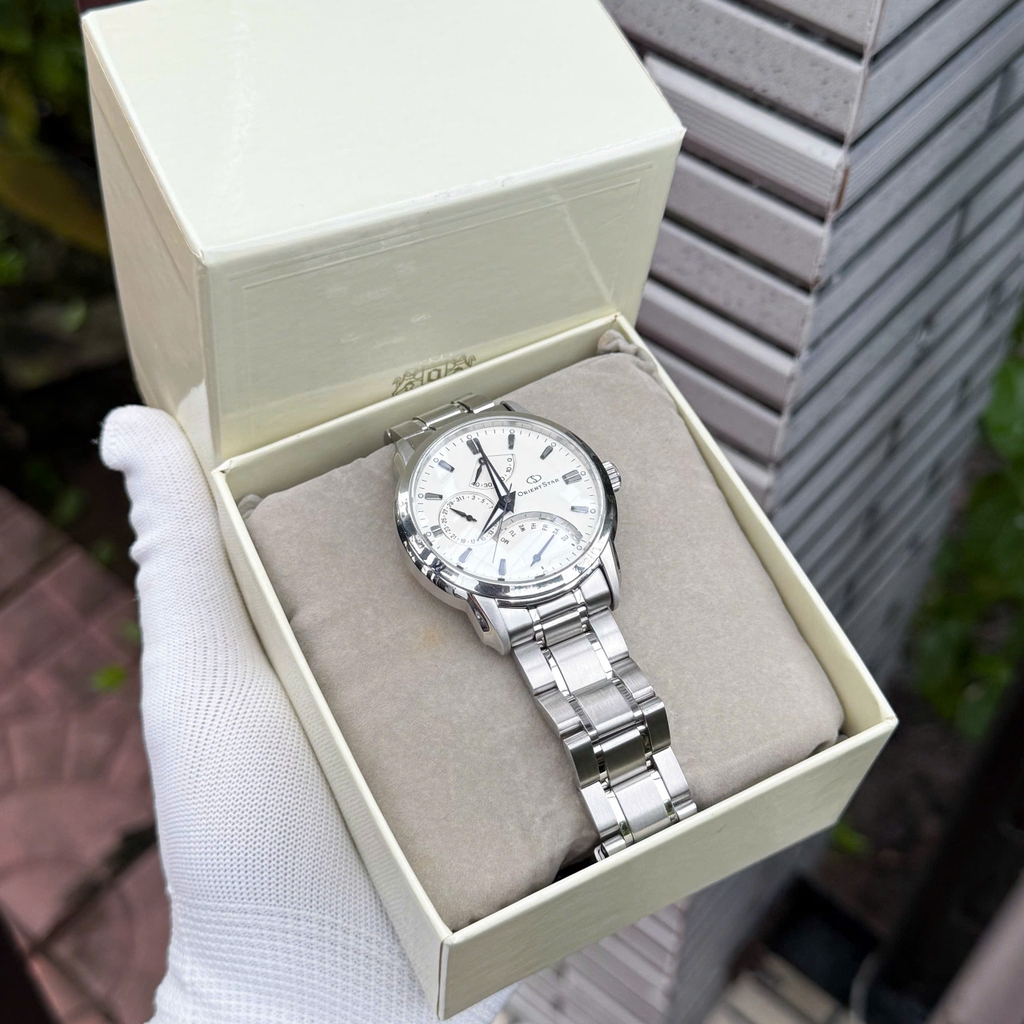 Orient Star WZ0061DE mang mặt số trắng bạc trang nhã, nổi bật với các ô hiển thị phụ tinh tế và kim xanh lam nổi bật. Cọc số dạng vạch mảnh sắc sảo, kính sapphire chống trầy cao cấp, vỏ và núm thép không gỉ sáng bóng tạo vẻ sang trọng. Khả năng chống nước 100M, phù hợp cho phong cách doanh nhân, công sở hoặc những dịp trang trọng cần sự tinh tế.