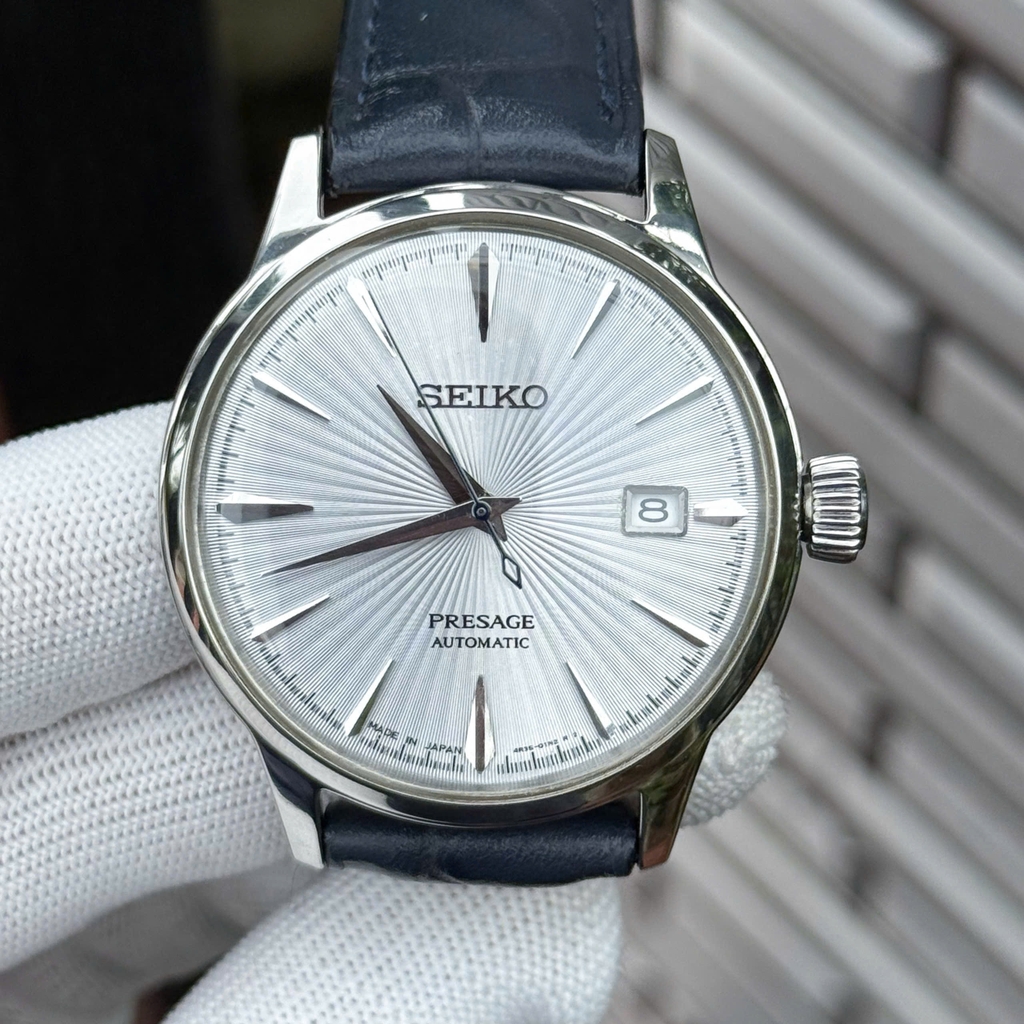 Seiko Presage SRPB43J1 có mặt số xanh nhạt ánh bạc hiệu ứng sunburst nổi bật, kim và cọc số mảnh mạ bạc tinh tế. Kính Hardlex cong, vỏ thép không gỉ sáng bóng, núm nhỏ gọn cổ điển. Khả năng chống nước 50 mét. Thiết kế thanh lịch, phù hợp phong cách công sở, tiệc tối hay trang phục vest lịch lãm.