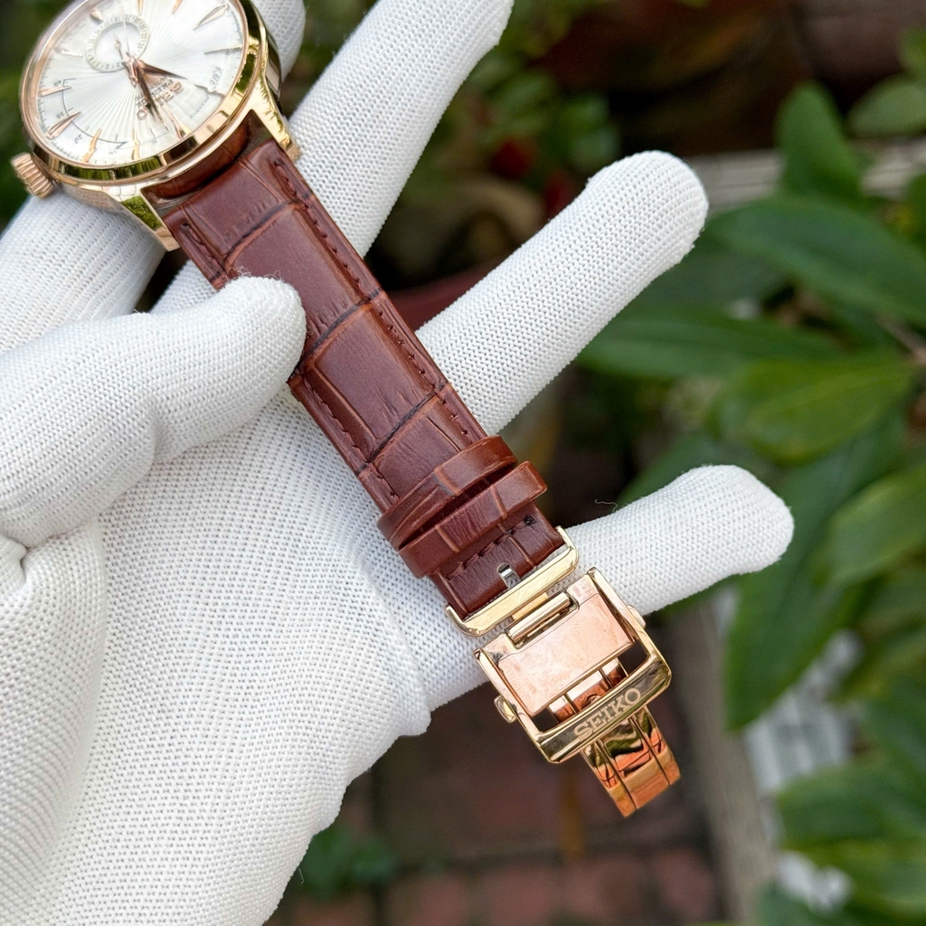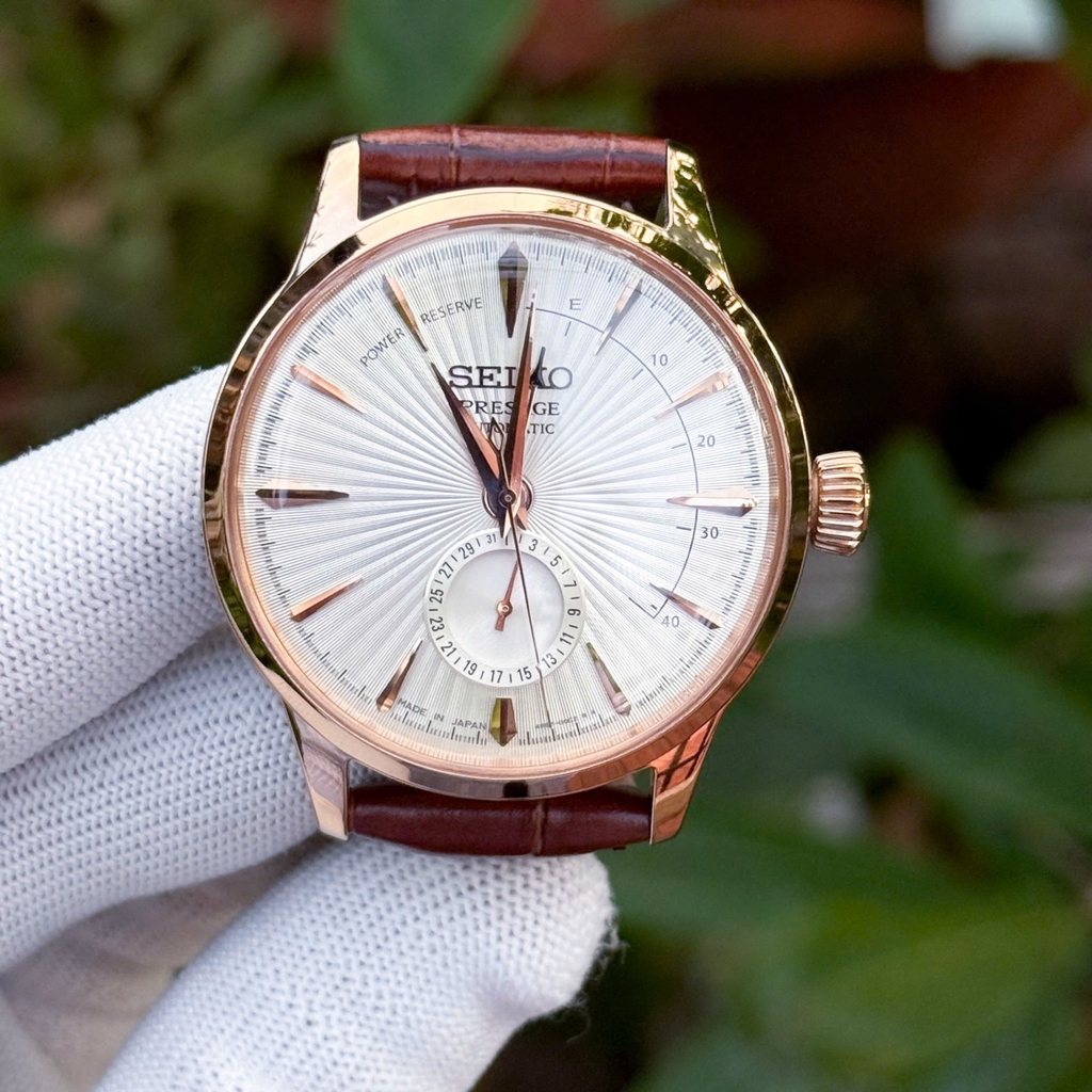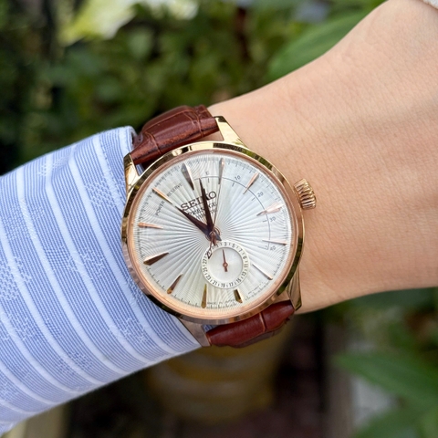 Seiko Presage Cocktail Time là dòng đồng hồ tôn vinh nghệ thuật pha chế cocktail Nhật Bản, kết hợp giữa kỹ thuật chế tác tinh xảo và cảm hứng thẩm mỹ hiện đại. Thiết kế nổi bật với mặt số sunburst bắt sáng rực rỡ, thể hiện sự sang trọng và tinh tế. Mỗi mẫu Cocktail Time đều mang phong cách thanh lịch, phù hợp cho người yêu thích vẻ đẹp cổ điển pha hiện đại.