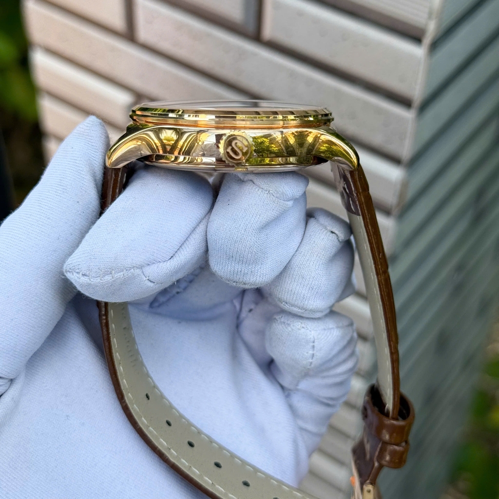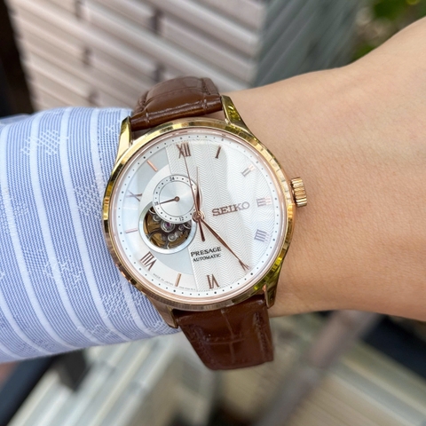 Seiko SARY154 sở hữu mặt số trắng chải guilloché, ô lộ bộ máy góc 9 giờ và kim, cọc số mạ vàng hồng nổi bật. Kính sapphire cong chống trầy cao cấp, vỏ thép không gỉ phủ PVD vàng hồng cùng núm chỉnh đồng tông. Khả năng chống nước 30 m (3 ATM). Với vẻ sang trọng lịch lãm, mẫu này phù hợp phong cách công sở, smart casual hoặc sự kiện nhẹ nhàng.