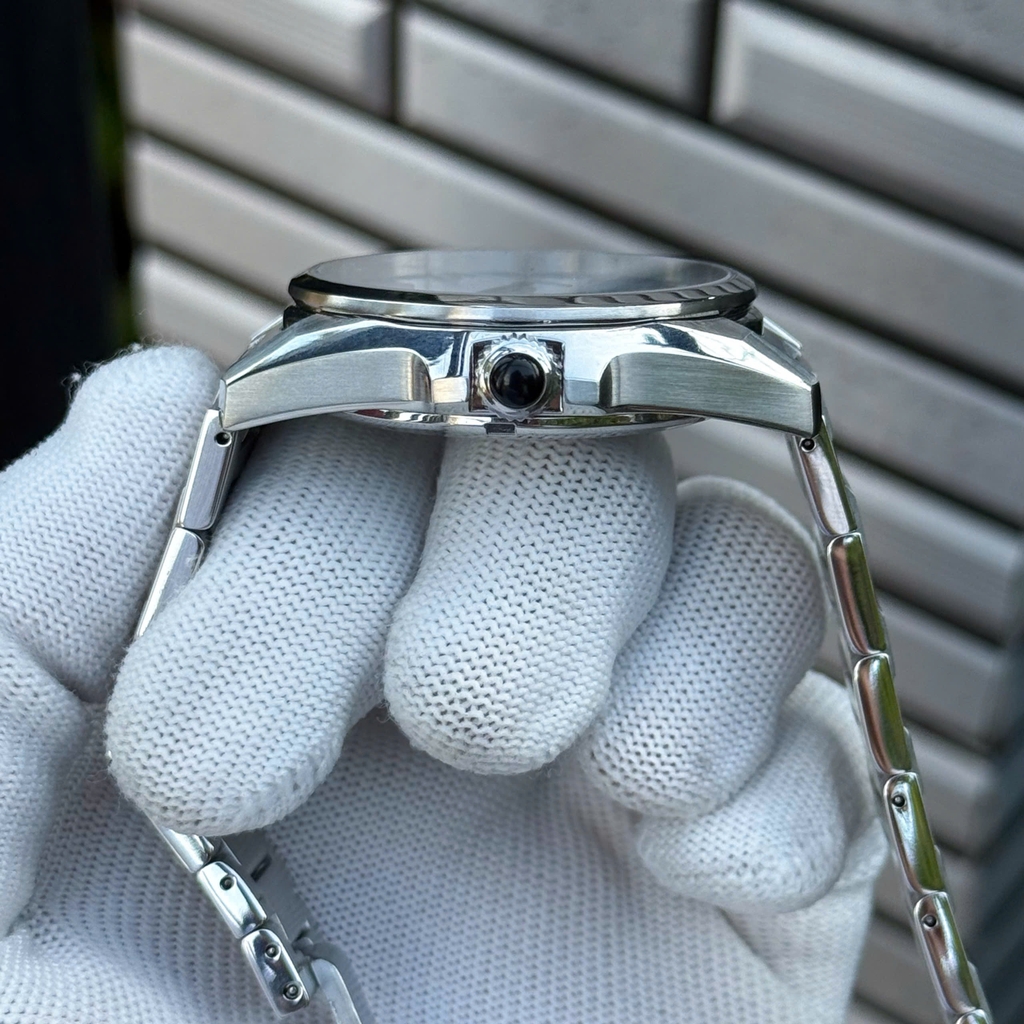 Mặt số xanh băng hiệu ứng sunburst, kim dauphine và cọc số thép sắc nét, kính sapphire chống trầy, vỏ thép không gỉ bạc cùng núm đồng bộ. Khả năng chống nước 10 ATM, dây thép sang trọng giúp dễ phối với suit, sơ mi hoặc trang phục công sở hiện đại. Toàn bộ thiết kế hướng đến sự tinh tế và phong thái nam tính trang nhã.