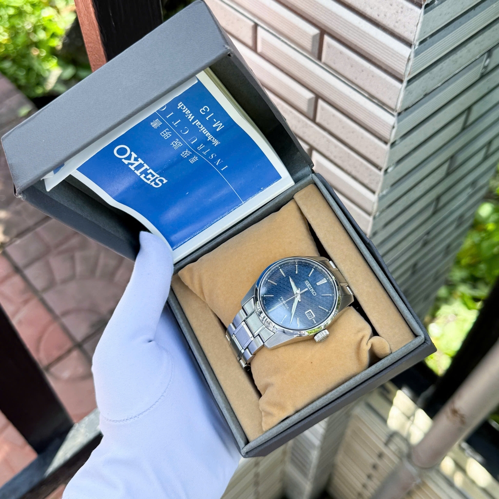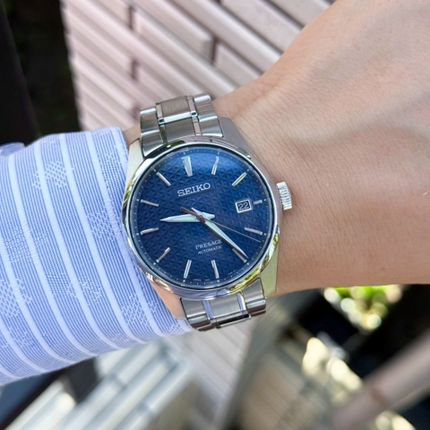 Seiko SPB167J1 nổi bật với mặt số xanh dương đậm khắc họa tiết hình học Asanoha truyền thống Nhật Bản, kim và cọc số bạc sắc nét. Vỏ thép không gỉ kết hợp kính sapphire chống trầy, núm vặn tinh tế đồng màu. Khả năng chống nước 100 mét giúp sử dụng linh hoạt. Thiết kế góc cạnh, hiện đại, phù hợp phong cách công sở và trang phục lịch lãm thường nhật.