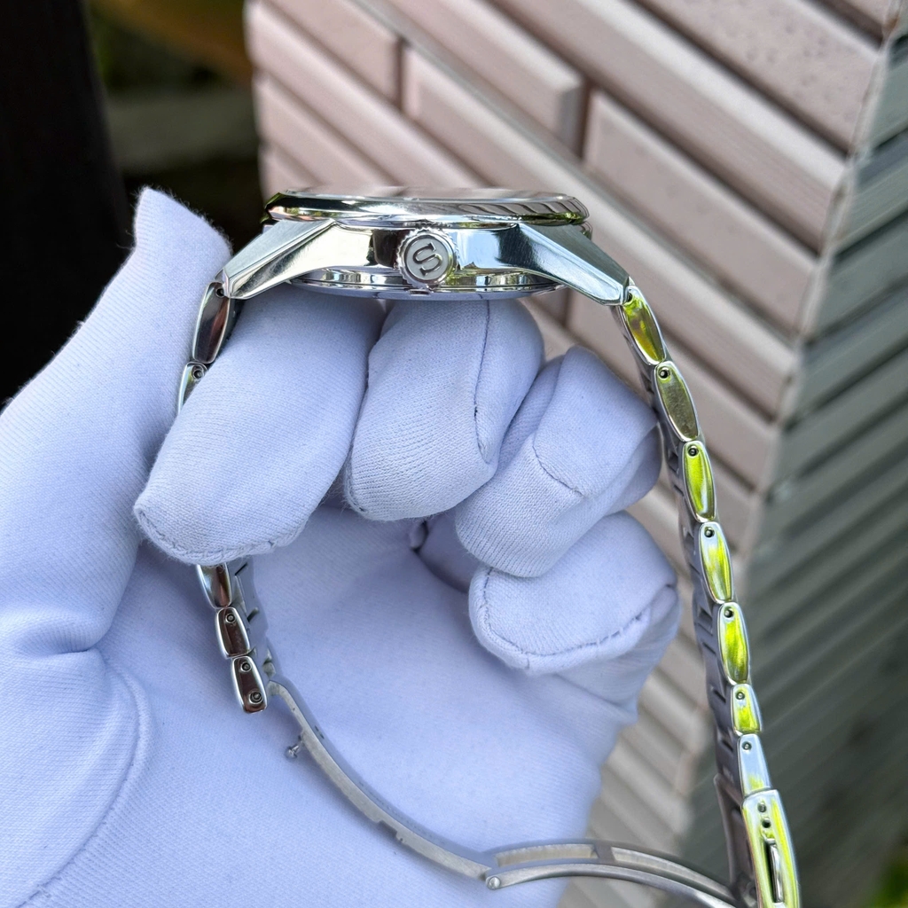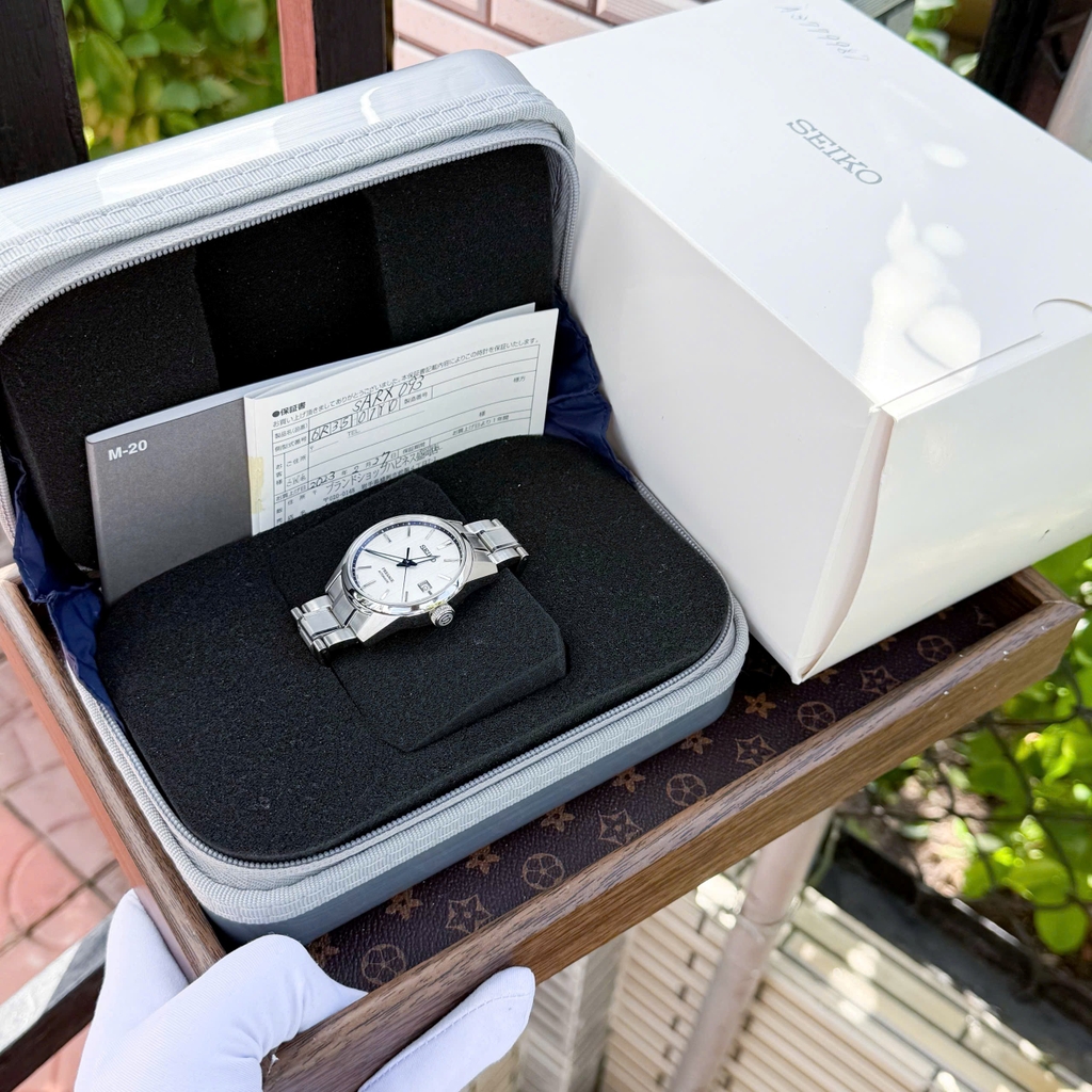 Chiếc SARX093 (bản Limited 0265/2000) trong tình trạng đã sử dụng có mặt số trắng / màu kem nhẹ với họa tiết Asanoha, thiết kế kim và cọc số kim loại mạ bạc. Mặt kính sapphire chống phản chiếu, vỏ và núm thép không gỉ mạ “super hard coating”. Khả năng chống nước 10 bar (100 m). Phong cách phù hợp: lịch lãm công sở, trang phục smart casual tinh tế.