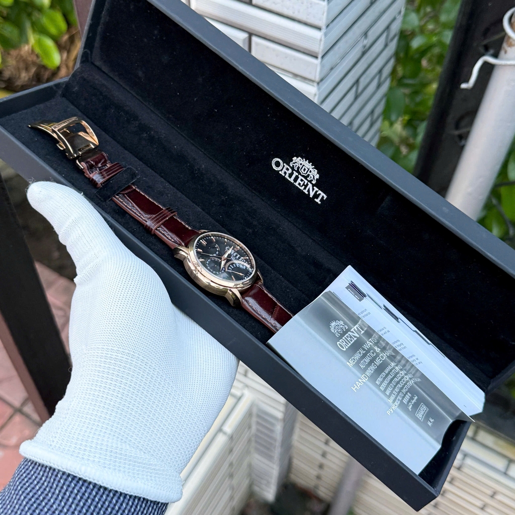 Orient Star SDE00003B0 sở hữu mặt số đen tuyền kết hợp các vòng hiển thị phụ tinh xảo, kim và cọc số mạ vàng hồng nổi bật dưới lớp kính sapphire chống trầy cao cấp. Vỏ thép không gỉ mạ vàng hồng sáng bóng cùng núm chỉnh đồng màu tạo vẻ mạnh mẽ, lịch lãm. Khả năng chống nước 100M, phù hợp cho doanh nhân hiện đại, phong cách công sở hoặc các dịp trang trọng sang trọng.
