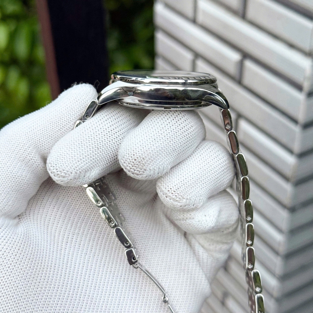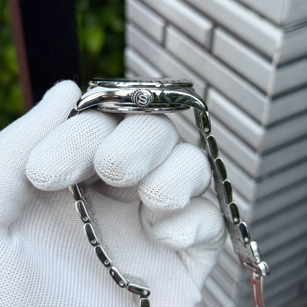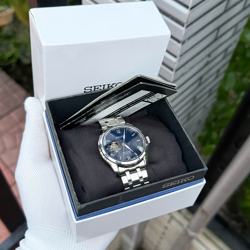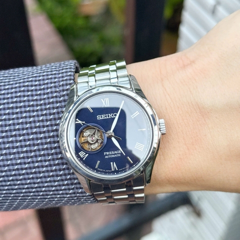 Seiko Presage SSA411J1 sở hữu mặt số xanh navy trang nhã với cửa sổ lộ cơ tại vị trí 9 giờ, kim và cọc số bạc thanh mảnh tạo nên bố cục cân đối. Kính sapphire cong đôi giúp phản chiếu ánh sáng tinh tế, vỏ và núm thép không gỉ sáng bóng mang cảm giác cao cấp. Khả năng chống nước 50 mét, phù hợp phong cách công sở, smart casual hoặc trang phục lịch lãm hàng ngày.