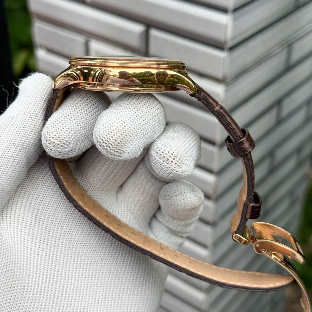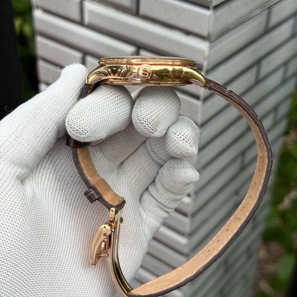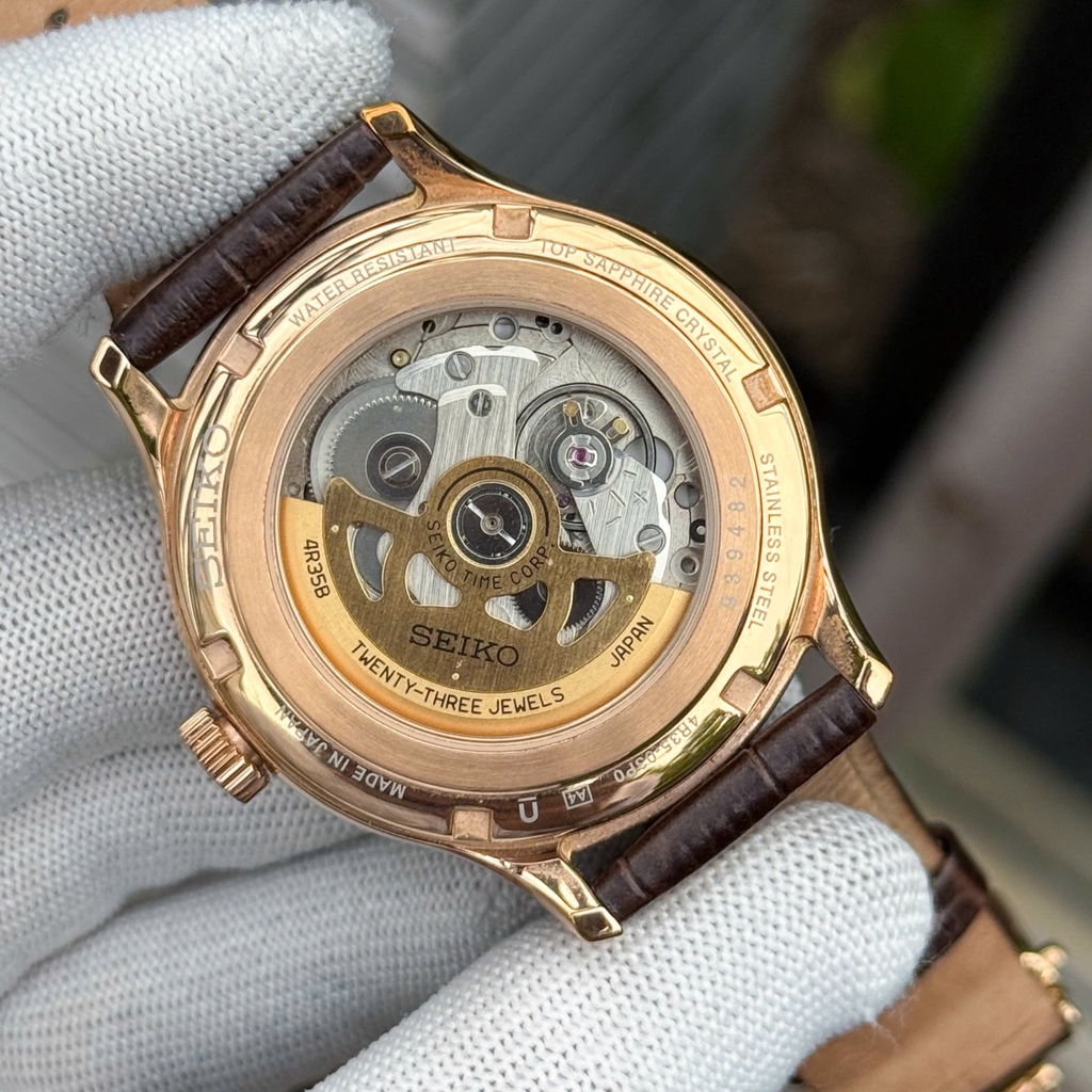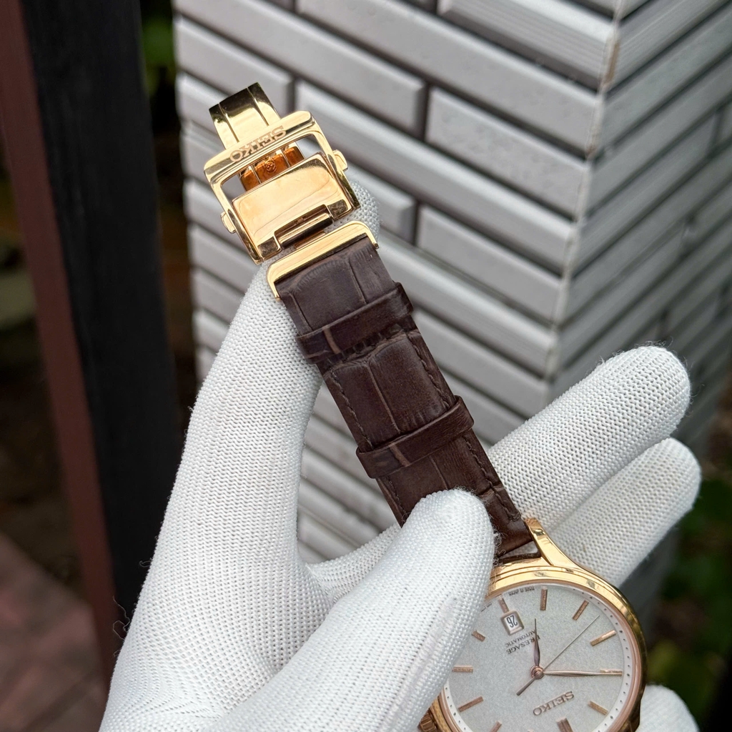 Seiko SRPD42 sở hữu mặt số trắng nhám mịn tựa cát vườn thiền, kim và cọc số mạ vàng hồng nổi bật đầy tinh tế. Vỏ thép không gỉ phủ vàng hồng sang trọng kết hợp dây da nâu cổ điển. Khả năng chống nước 30 mét, phù hợp phong cách công sở, dạ tiệc hay các dịp trang trọng thường ngày.