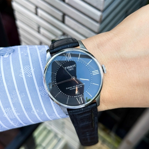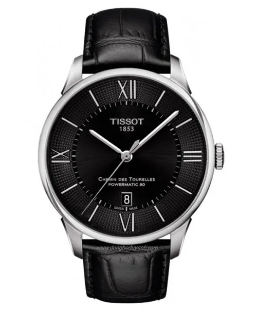 Tissot Chemin Des Tourelles T099.407.16.058.00 mặt số đen kết hợp kim pencil và cọc số La Mã thanh lịch, kính sapphire chống trầy, vỏ thép không gỉ bạc cùng núm đồng bộ. Khả năng chống nước 5 ATM, đi kèm dây da đen tạo vẻ sang trọng và dễ phối cùng suit, sơ mi hoặc trang phục lịch lãm hàng ngày.