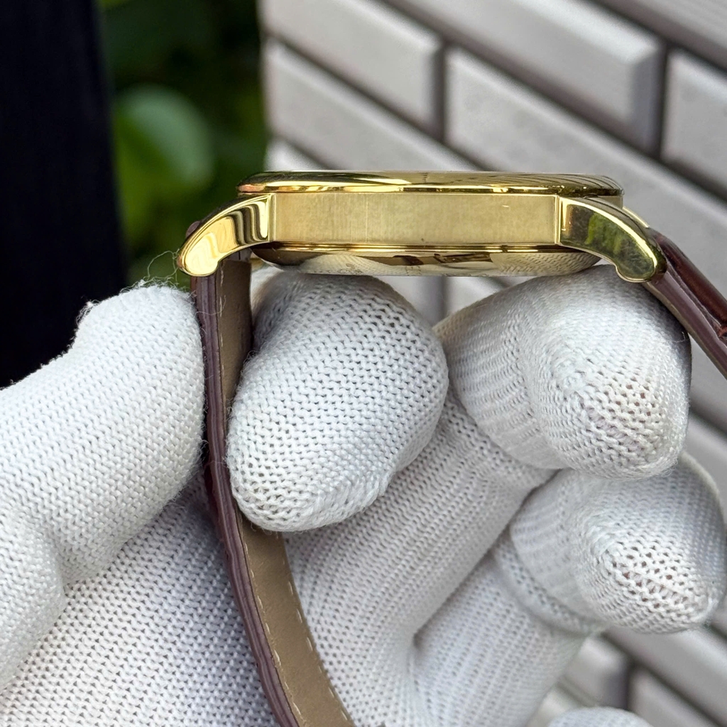 Mẫu đồng hồ sở hữu mặt số trắng ngà họa tiết guilloche dạng kim cương ở trung tâm, tạo chiều sâu cổ điển tinh tế. Cọc số kết hợp La mã mạ vàng tại các vị trí chính cùng cọc đính kim cương làm điểm nhấn sang trọng. Vỏ thép mạ vàng PVD, núm cùng tông, kính sapphire. Dây da nâu vân cá sấu, phù hợp phong cách vest, công sở và trang phục trang trọng cổ điển.