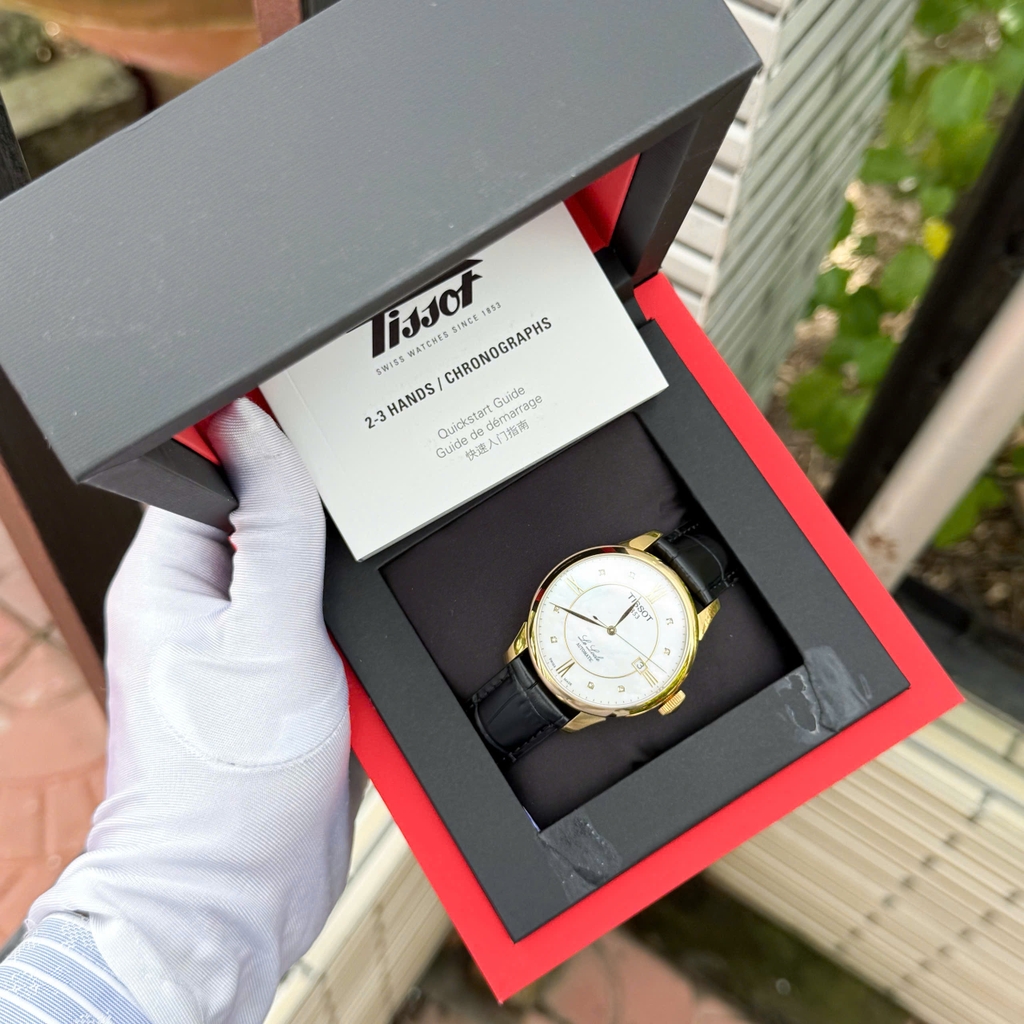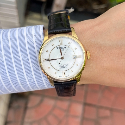 Tissot Le Locle Mop Diamond T41.5.453.86 sở hữu mặt số khảm trai thiên nhiên điểm 8 viên kim cương tinh tế, kim và cọc số mảnh mạ vàng sang trọng. Vỏ thép không gỉ, kính sapphire chống trầy, núm mạ vàng gold, chống nước 30 mét. Thiết kế thanh lịch, trang nhã, phù hợp cho trang phục sang trọng hoặc công sở.