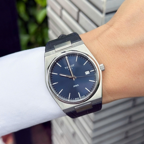 Tissot PRX Blue T137.410.16.041.00 sở hữu mặt số xanh dương ánh sunburst, kim và cọc số phủ dạ quang, kính sapphire chống trầy, vỏ thép không gỉ bạc sáng cùng núm đồng bộ logo T. Dây da xanh đậm thanh lịch, độ chống nước 100m giúp an tâm khi đi mưa hay rửa tay. Phù hợp với phong cách smart casual và business.