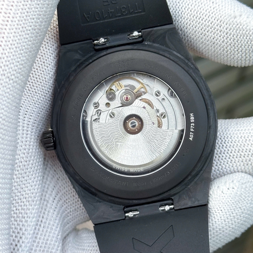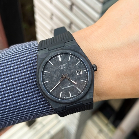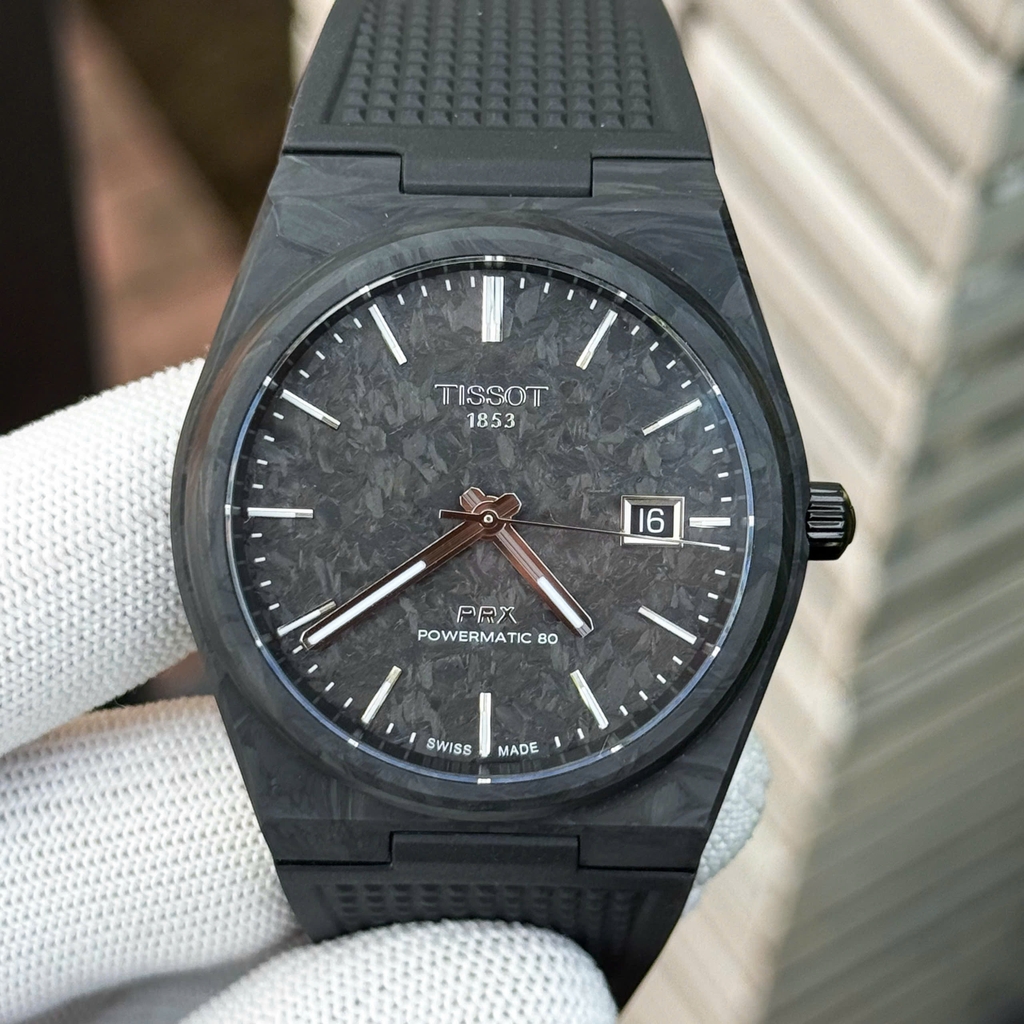 Dòng Tissot PRX Forged Carbon là sự kết hợp giữa tinh thần thể thao hiện đại và nghệ thuật chế tác cao cấp. Thiết kế kế thừa hình dáng đặc trưng của PRX với vẻ ngoài mạnh mẽ, sang trọng nhưng vẫn nhẹ nhờ vật liệu tiên tiến. Sự xuất hiện của chất liệu carbon rèn giúp tăng độ bền và tạo hiệu ứng ánh sáng độc đáo, mang lại phong cách năng động và đậm chất tương lai.