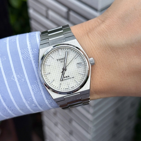 Tissot PRX MOP T137.207.11.111.00 sở hữu mặt số khảm trai trắng ánh sắc tự nhiên, kết hợp kim và cọc số bạc tinh tế. Kính sapphire chống trầy, vỏ và dây thép không gỉ màu bạc cùng núm đồng bộ. Khả năng chống nước 100 mét, phù hợp với phong cách thanh lịch, hiện đại, dễ phối cùng trang phục công sở hoặc dạo phố cao cấp.
