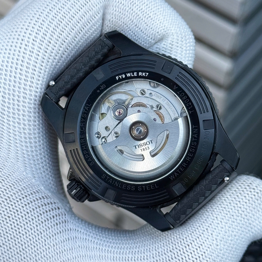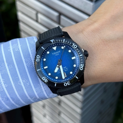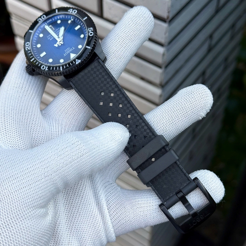 Chiếc Tissot Seastar 1000 Blue T120.807.37.041.00 có mặt dial chuyển màu xanh-đen, kim lặn phủ dạ quang và cọc giờ dạng tròn và thanh. Kính sapphire chống trầy, vỏ thép mạ PVD đen mạnh mẽ kèm niềng xoay, núm vặn vít. Khả năng chống nước lên đến 300 m, kết hợp dây cao su đen thể thao, phù hợp trang phục dạo biển hoặc phong cách casual tinh tế.